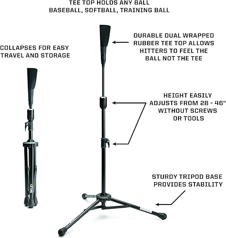 The SKLZ tee is perfect for plane or bus travel because of its tri pod fold up design and its durability. Their unique design promotes proper swing mechanics and body positioning transforming good players into great players. It quickly folds out for easy setup and folds down and fits easily into a bat bag.